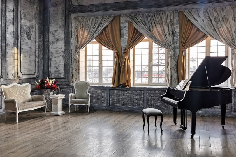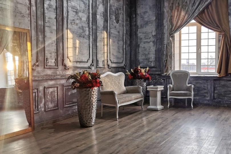 Винтажные полы под дерево гармонично дополняют холодные серые стены и огромные 6 метровые потолки.