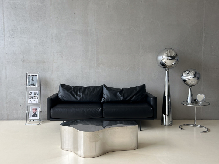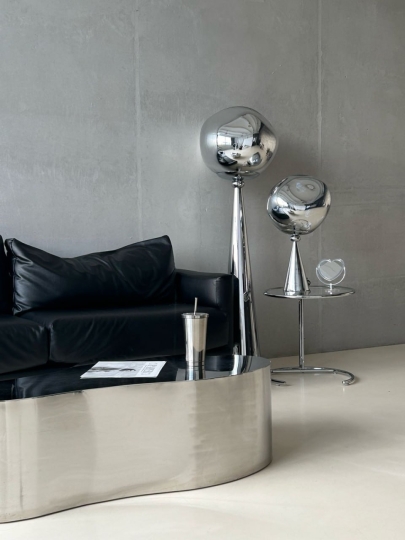 - Черный кожаный диван, два металлических торшера, дизайнерское кресло Wassily chair, черный столик, прозрачный журнальный столик, огромный диско-шар, большое серое кресло, белый стул, серая металлическая тележка;