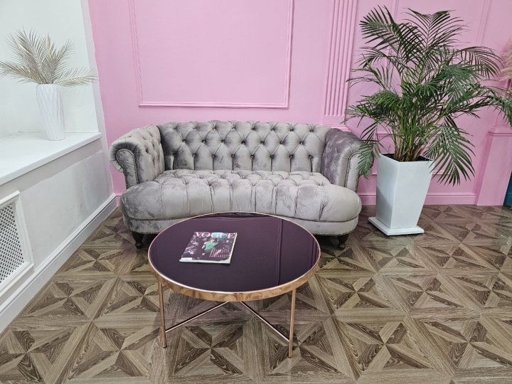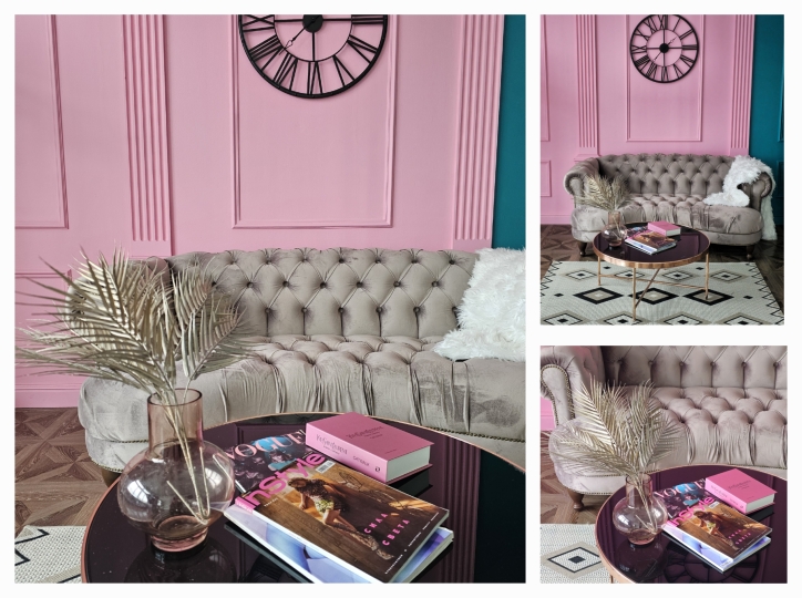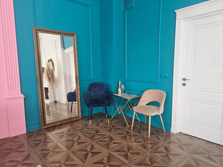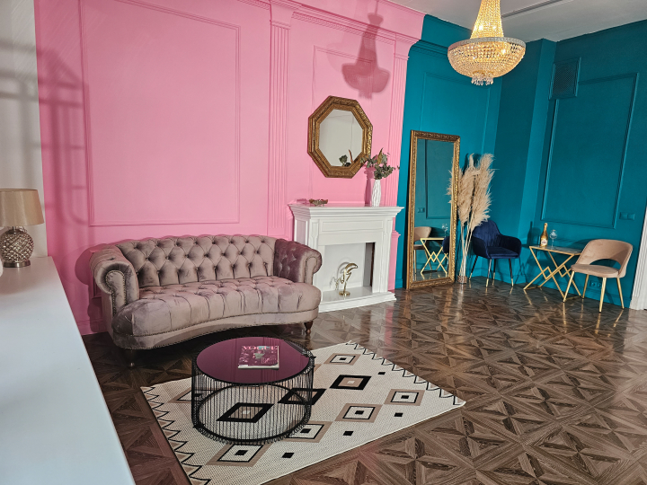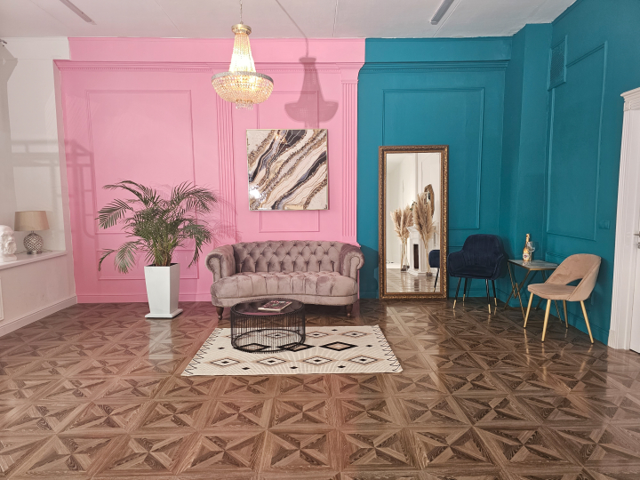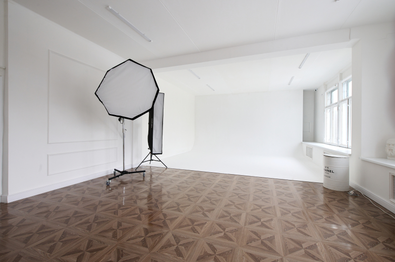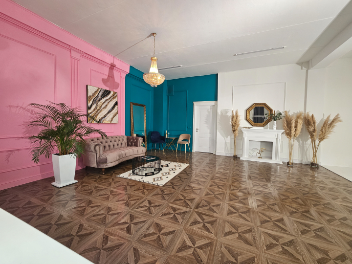 Зал разделён на 2 части: с одной стороны циклорама, с другой - пространство, ориентированное на fаshiоn съемку со стенами разного цвета (белая, розовая, сине-зеленая), дизайнерской мебелью.