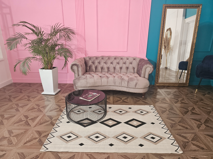 - серо-бежевый диван, черный журнальный столик;