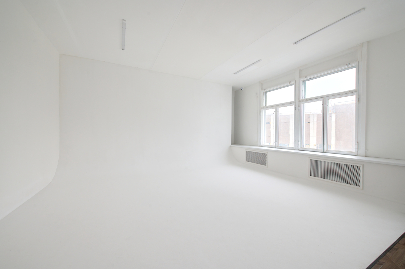 ЗАЛ ВRАND (80 м²) просторный, очень светлый зал с естественным светом, большой белой циклорамой и большими окнами.