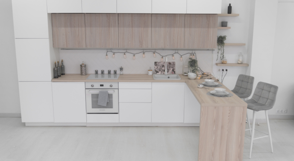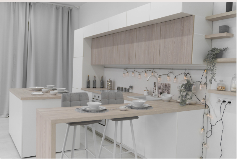 - ПОЛНОСТЬЮ РАБОЧАЯ КУХНЯ: остров на колесиках, барная стойка, холодильник, плита, духовка, посуда, раковина с водой;
