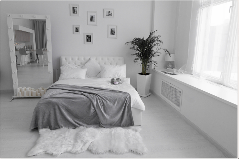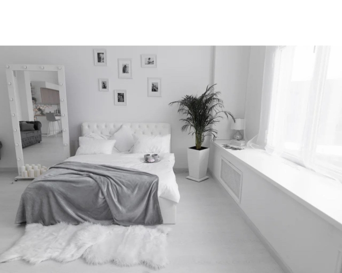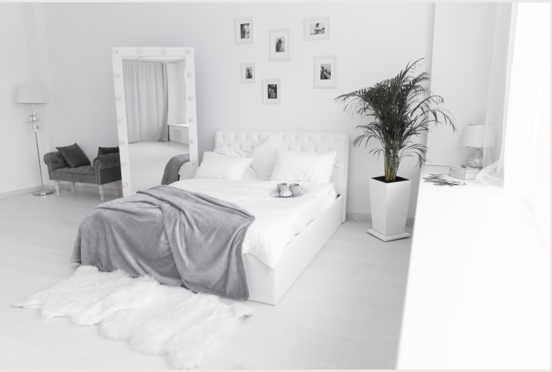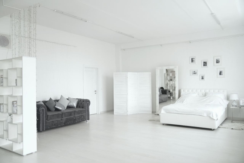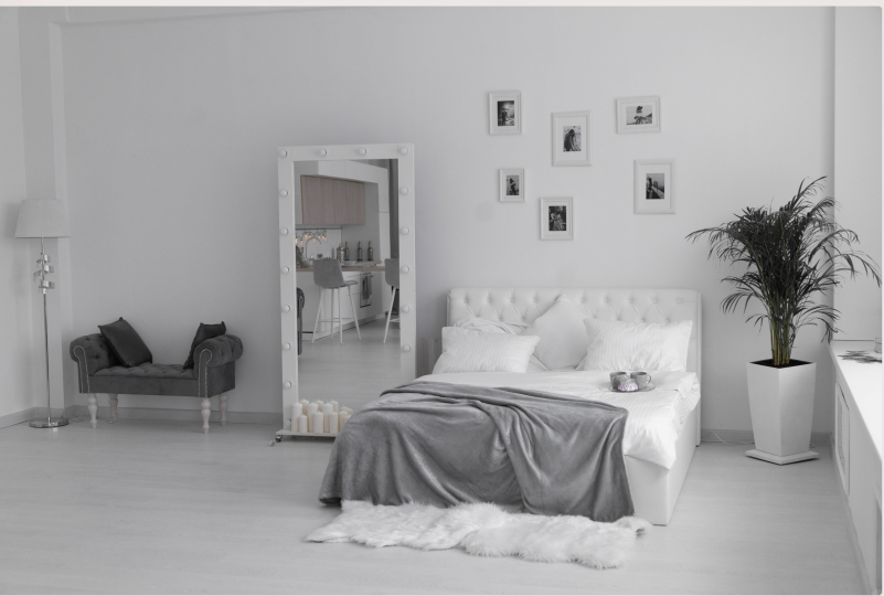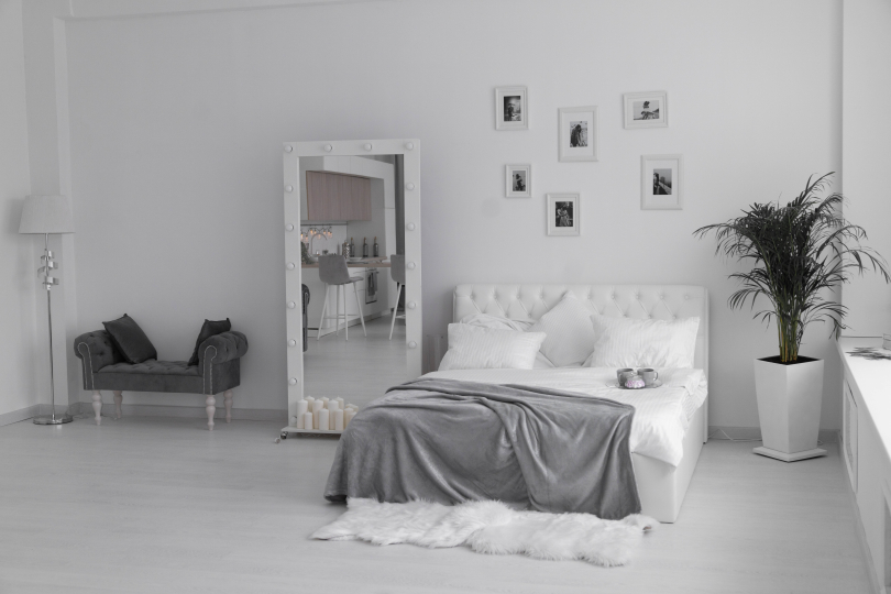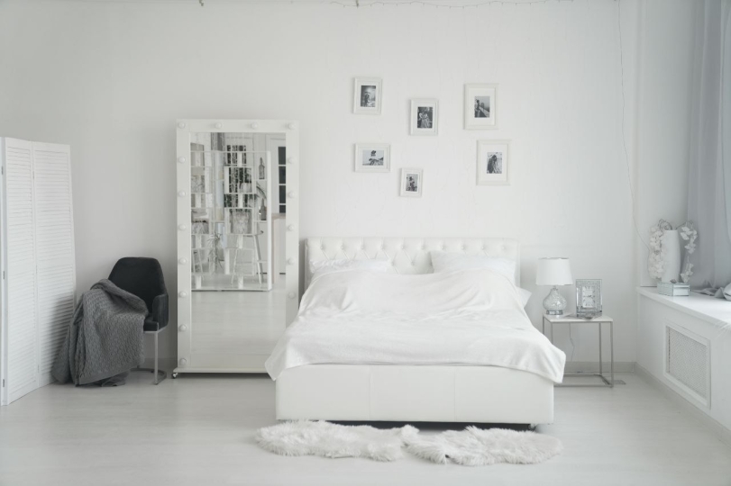 - белое зеркало, вешалка для одежды, белая ширма;