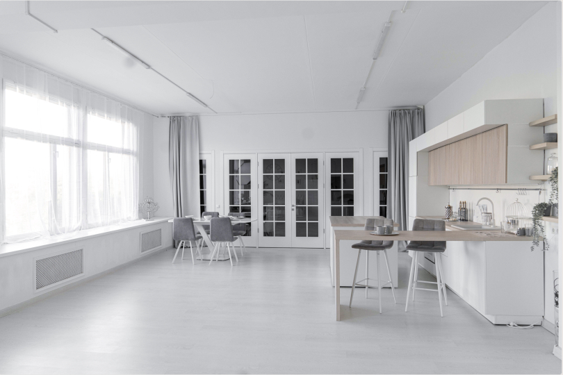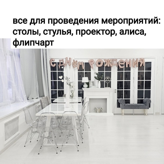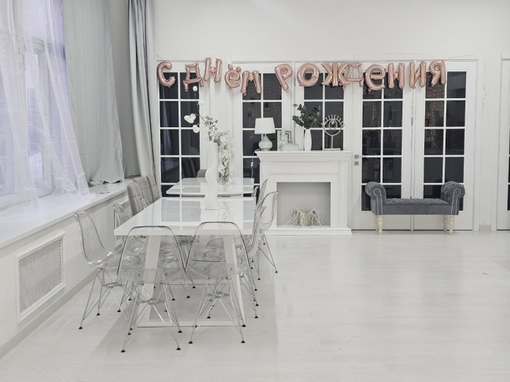 м² с естественным светом, большими окнами, белыми полами, есть шторы блэкаут. Этот зал идеально подходит для различных съёмок контента в едином стиле: семейных, lоvеstrоry, контента для соц сетей и тд и проведения мероприятий.