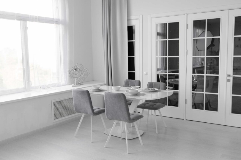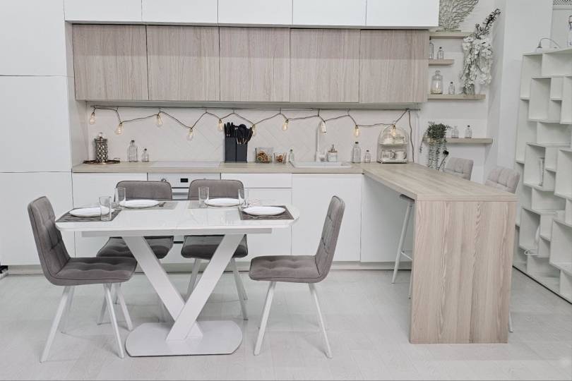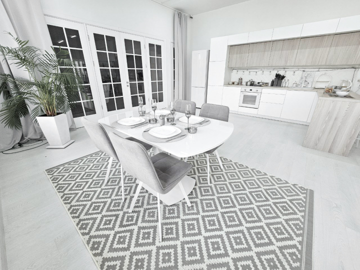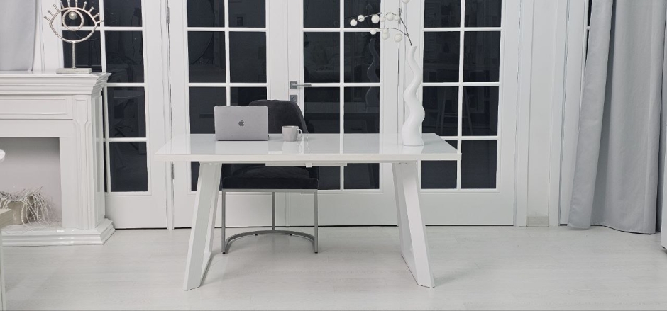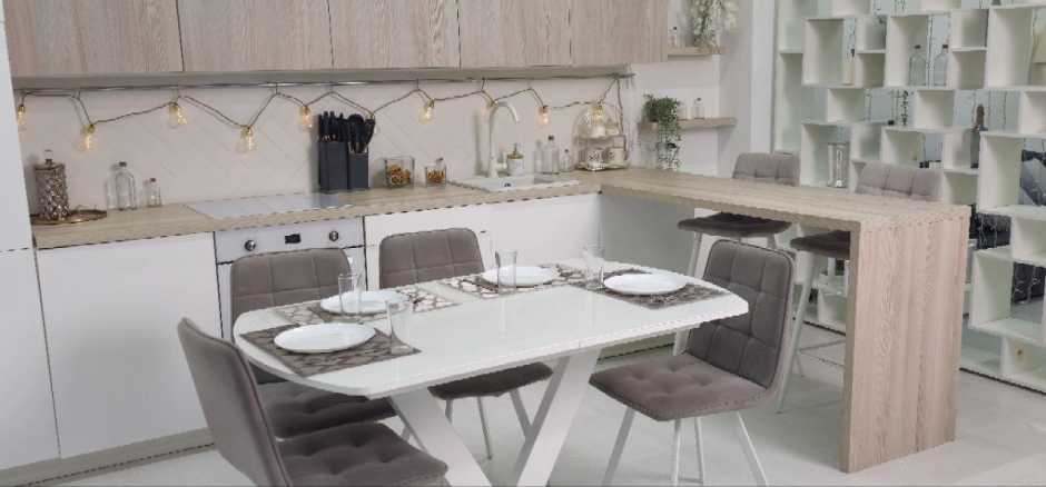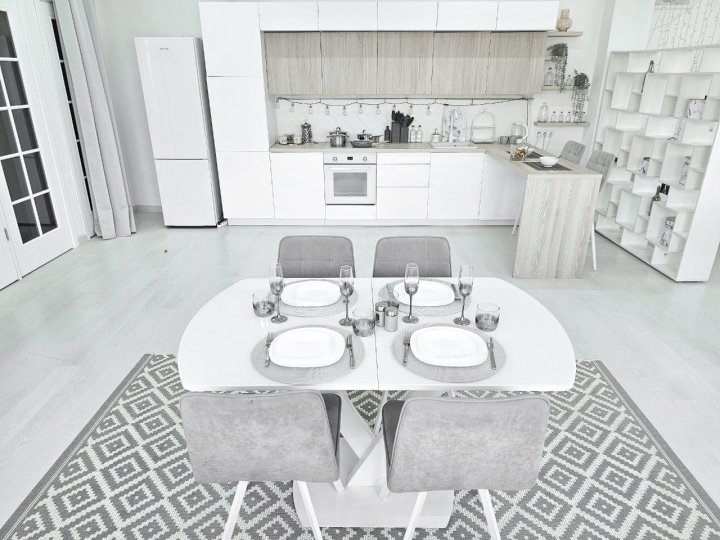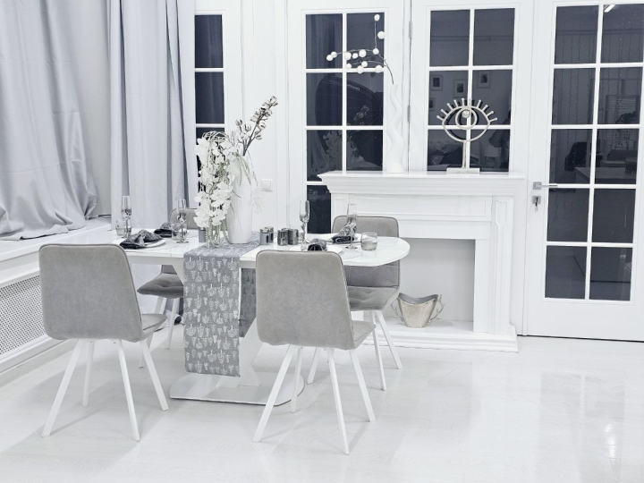 - 2 раздвижных белых обеденных стола со стеклянной столешницей, сервировкой, стульями (размеры столов: 1) с закругленными краями: 85x140 (180 разложенный), высота 80; 2) прямоугольный: 90x160 (200 разложенный)