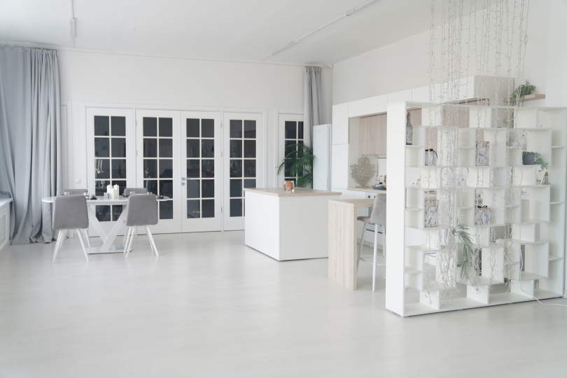- большой белый стеллаж с декором, журнальные столики, серое кресло;