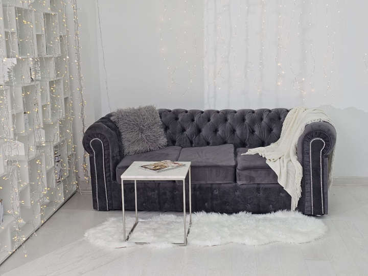 - серый велюровый диван (на колесиках);