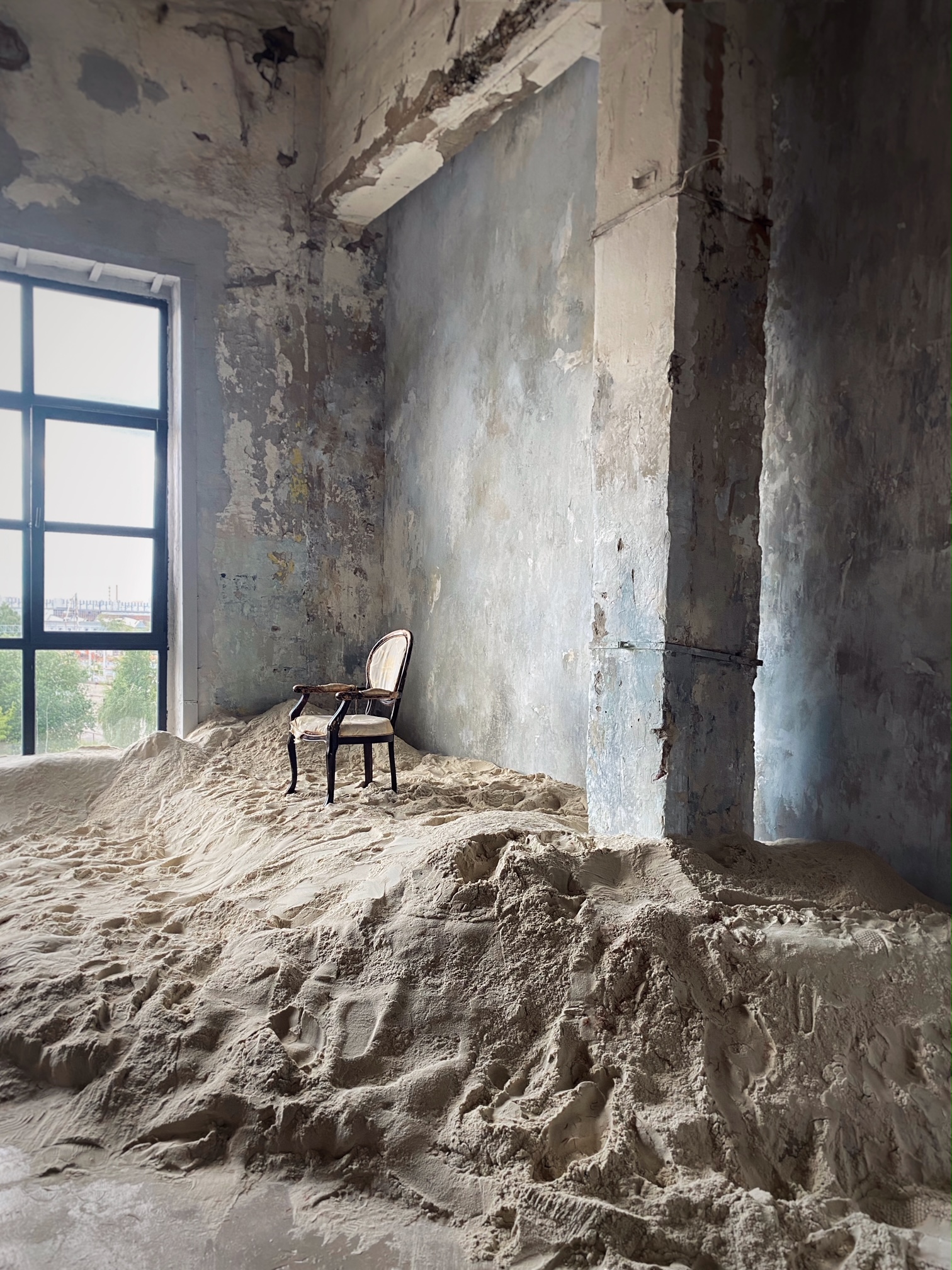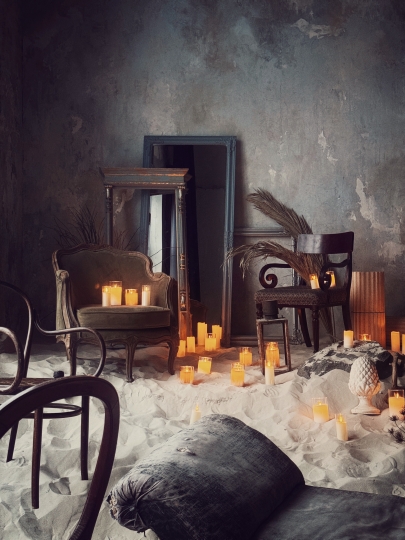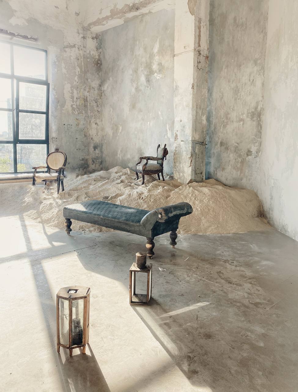 Зал Песок - второй зал третьего студийного проекта команды PROSTRANSTVO, выполнен как комната заброшенного усадебного дома, где время и стихия красиво старят стены, потолки, пол и мебель.