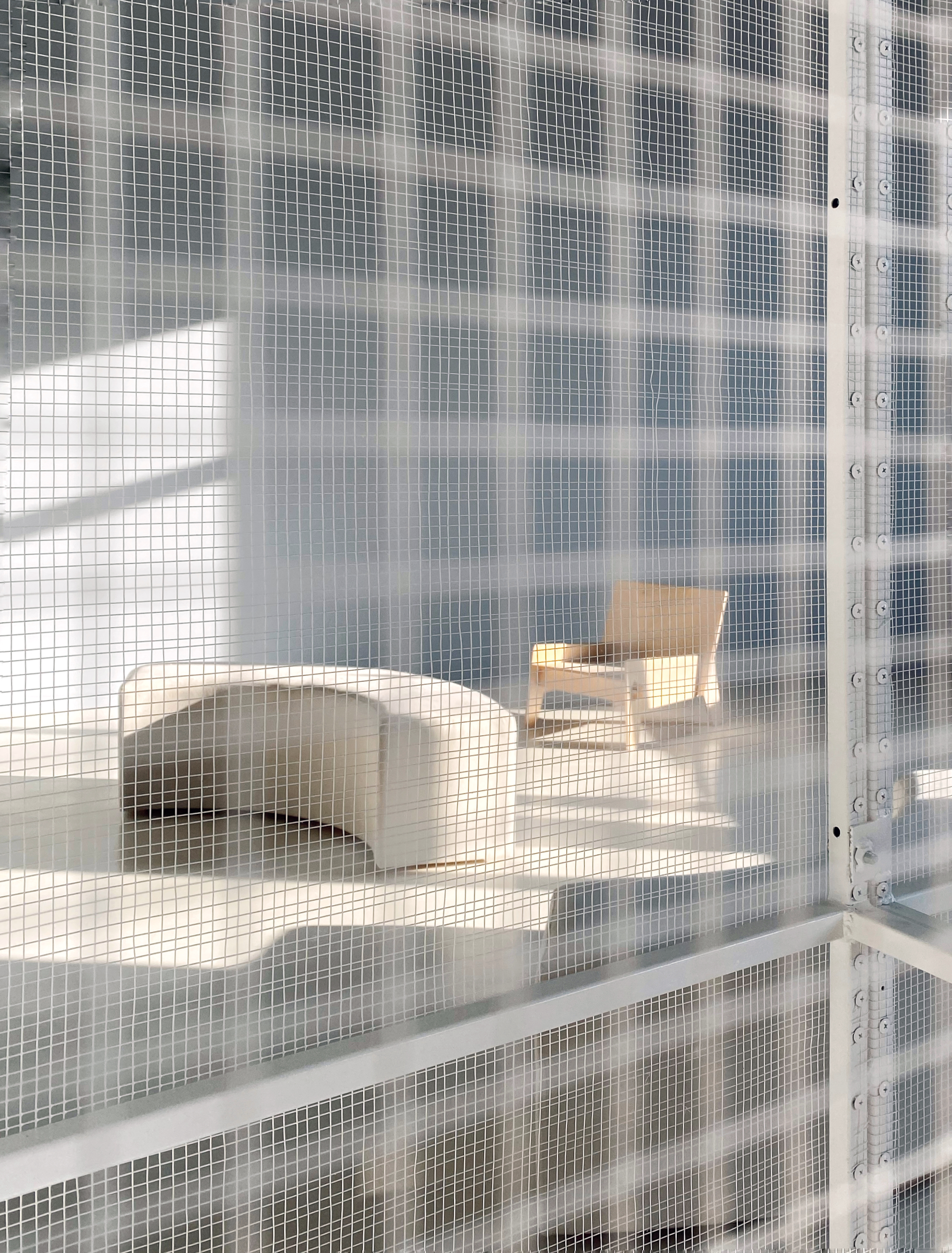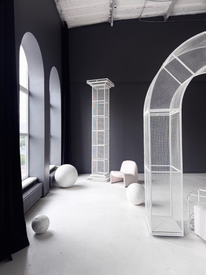 элементами стали минималистичные декорации, почти невесомые и как бы парящие в воздухе, несмотря на свои внушительные размеры. Такой эффект создается благодаря тончайшим металлическим сеткам, что придает конструкции эффект прозрачности и легкости. Колонны разных форм с дорическими капителями соседствуют с современными простыми конструкциями, а светлая современная мебель, сделанная по индивидуальному заказу, подчеркивает футуристичность интерьера.
