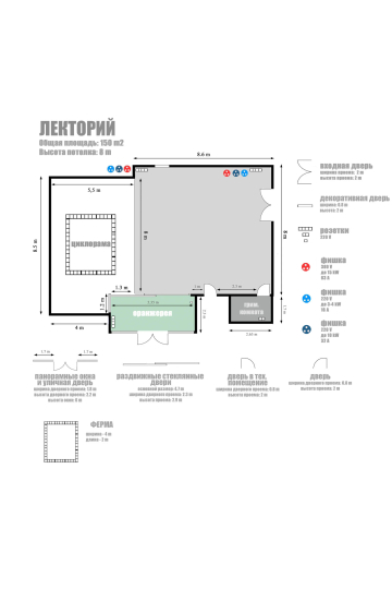 В зале Лекторий установлена большая циклорама — 9 х 5,5 метров, — и она имеет два тарифа: