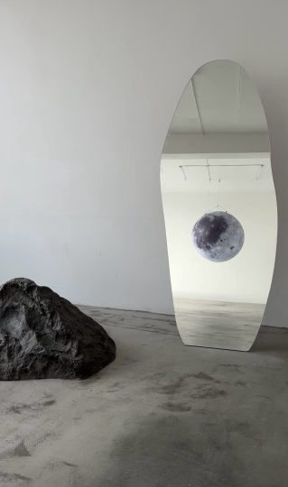 Интерьер: луна, природные камни, настенная система установки бумажных фонов (в стоимость зала включены два бумажных фона без раскатки: черный и серый), стол, диван, стулья, бетонная стена, зеркало высотой 2м, шторы блэкаут (затемнение в дневное время не более 70%)