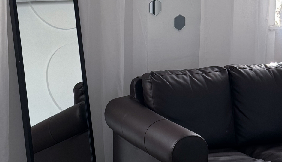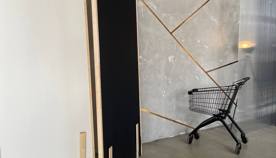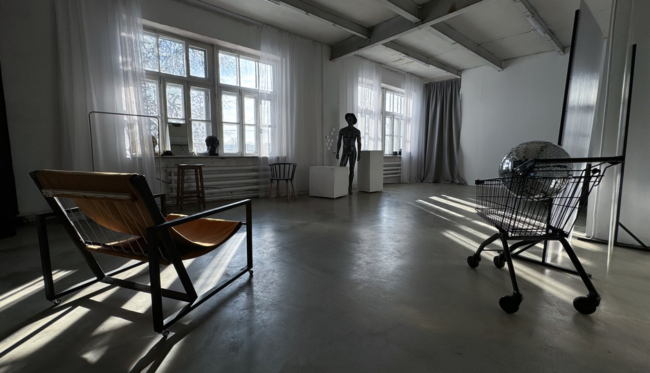 Просторный зал в скандинавском стиле с четкими линиями на стенах. В зале присутствует лаконичный диван серого цвета, ковер, зеркала, стулья, большие кубы в виде подарков, манекен Джей, живые елочки. Всю мебель