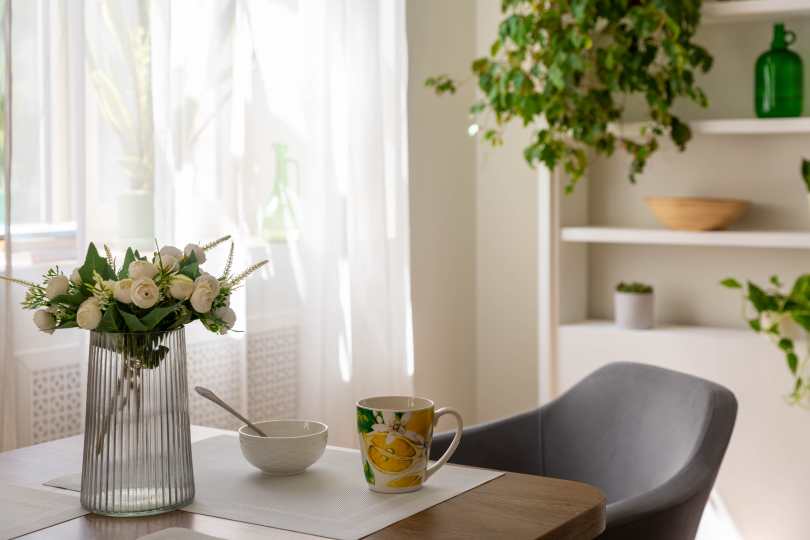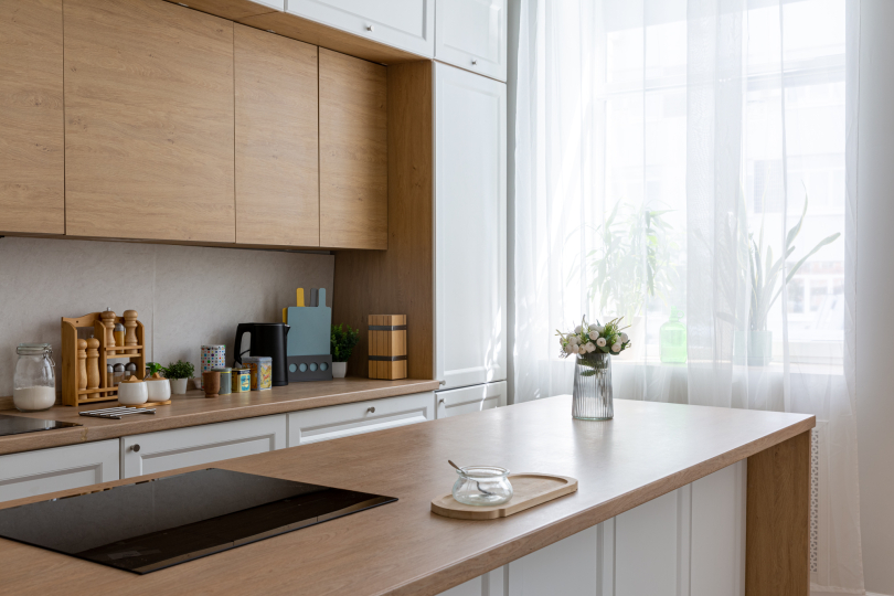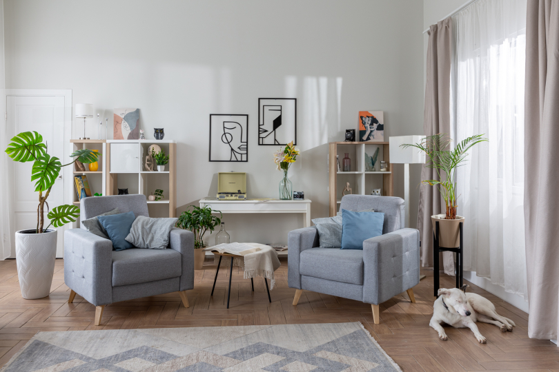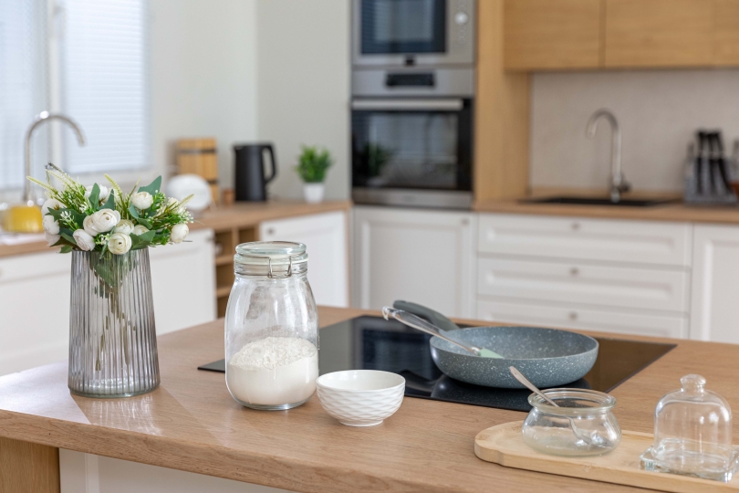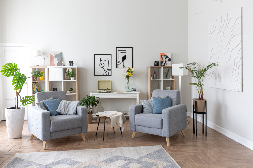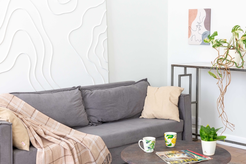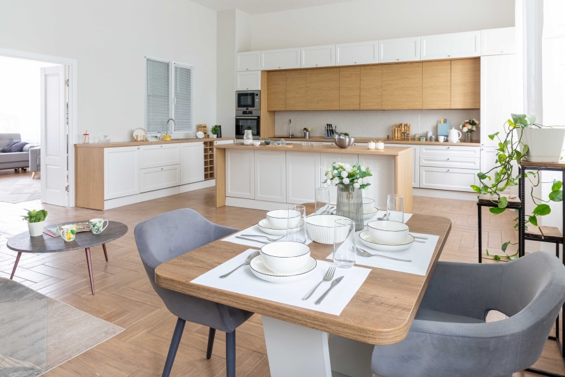 Большой светлый зал с интерьером квартиры в современном стиле и действующей пятиметровой кухней с двумя индукционными варочными поверхностями, духовым шкафом, микроволновой печью и бытовой техникой. В студии две отдельных гримерных комнаты, техническая кухня, три собственных
