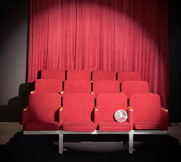 В зале декорация кинозала (3 ряда по 4 сиденья)