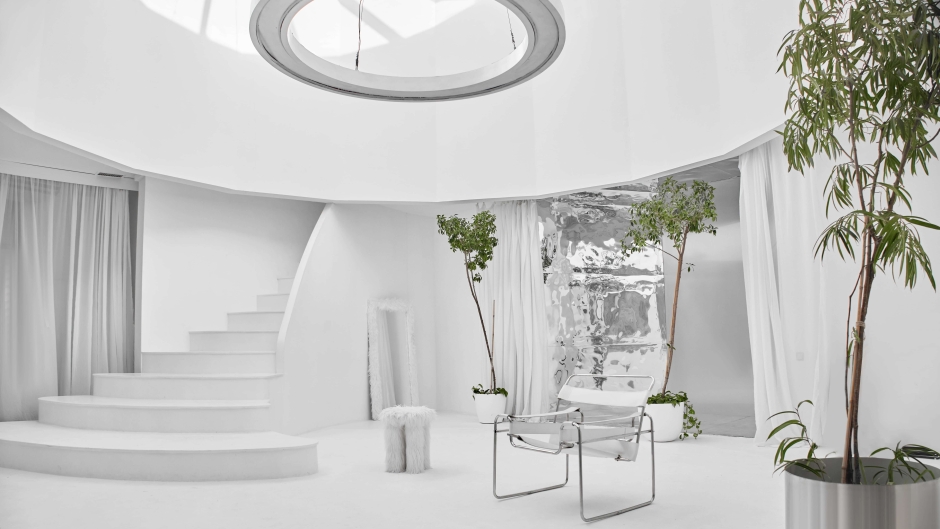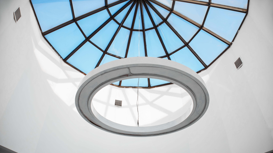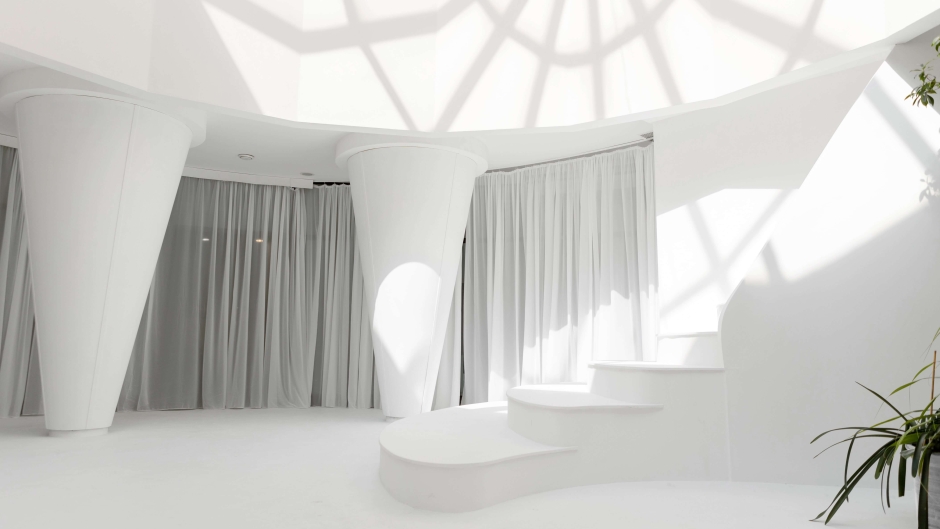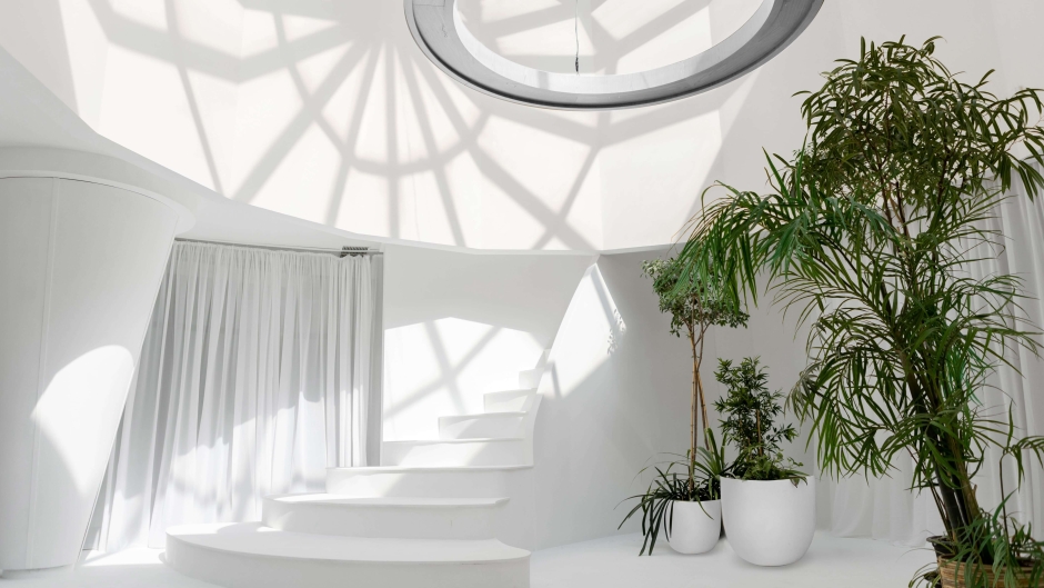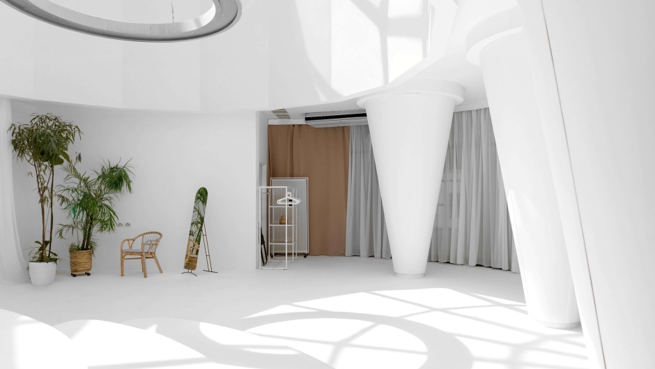 Белый просторный зал под куполом, прямые солнечные лучи падают на пол и стены, передвигаются в течение дня по всему пространству. Высокий панорамный потолок. Лестница, колонны, зеркальная зона, драпировочные ткани. Возможность установки любого фона из наличия,