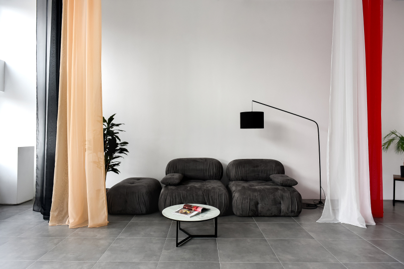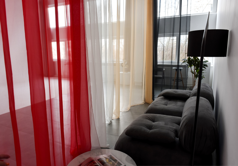 Легкие полупрозрачные ткани молочного, красного, черного и бежевого цветов на полукруглом карнизе.