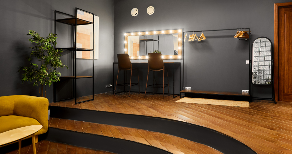 Новый эффектный съёмочный зал с фактурными бетонными стенами, деревянным полом, стильной мебелью, просторным гримерным местом и большой циклорамой размером 4х5 м.