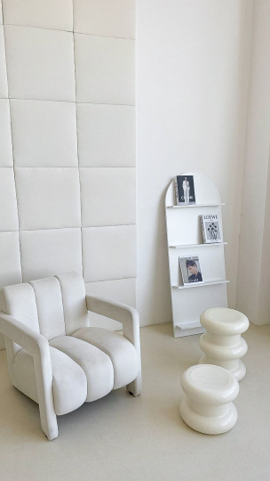 В зале есть две белых стены и стена из бежевых объемных квадратов . А также белые полы и огромное окно размером 5,6×2,8 м, которое хорошо освещает зал.