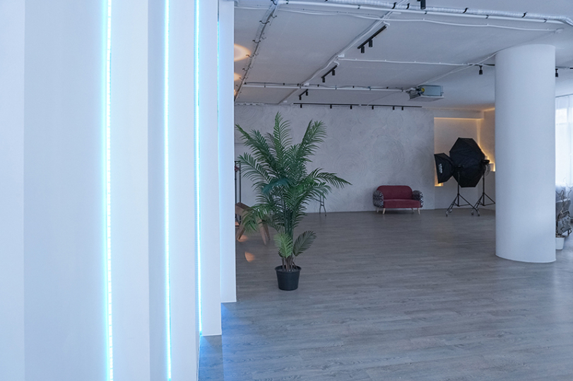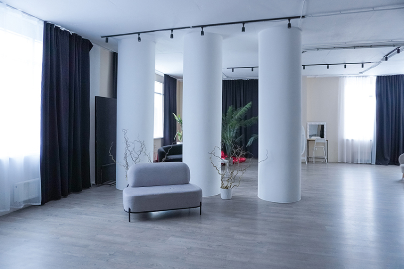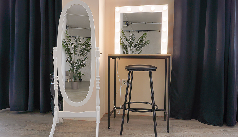 Оснащение: гримерный стол, шторы 100% блэкаут; 2 флага; , рейл для одежды, зеркало в полный рост, решетка, стол для фотографа, экран для проектора