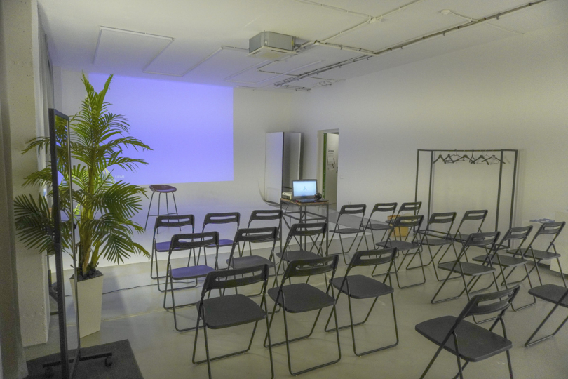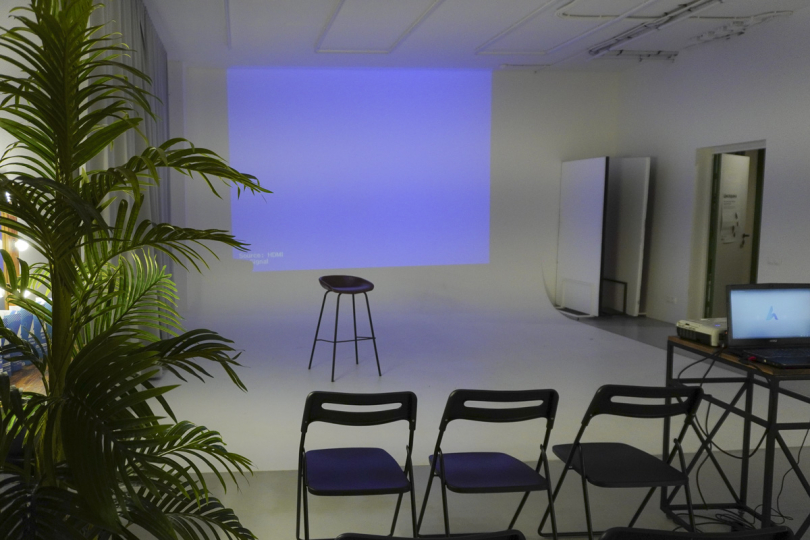 Имеется флипчарт, стулья, стол и проектор.