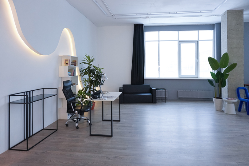 Просторный зал с белой циклорамой шириной 5,2 м. с выступом на 4 м. и большими окнами на солнечной стороне (закатное солнце), что дает много естественного света с двух сторон. Так же в зале имеются шторы
