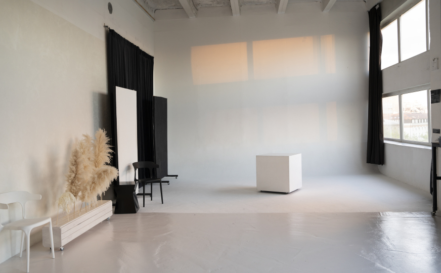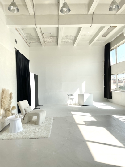 зал, с белым полом, солнечная сторона, циклорама 6,5 на 6 метров, потолок 5 метров. Блэкаут-шторы.