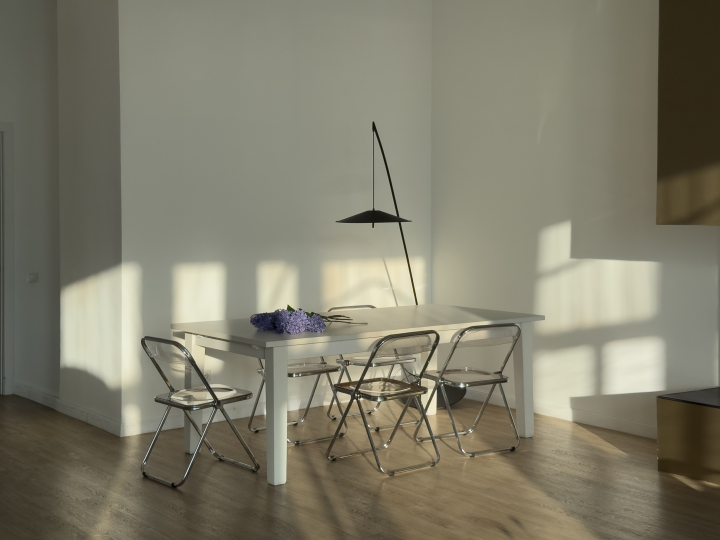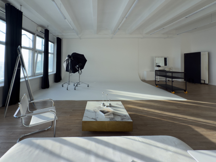 - Большой белый стол на 12 персон — зона для съемок с сервировкой или небольших мероприятий.