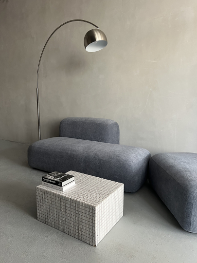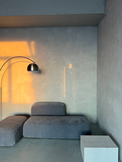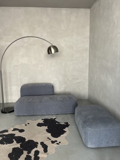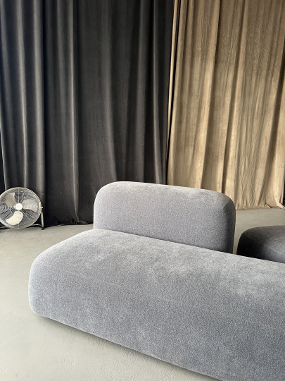 В противоположной стороне зала стены под бетон, кирпичная стена, фигурный модульный диван