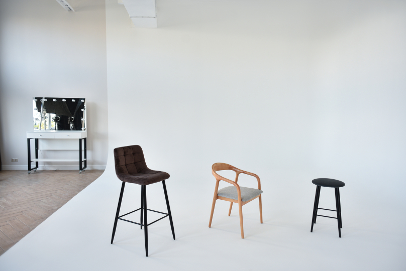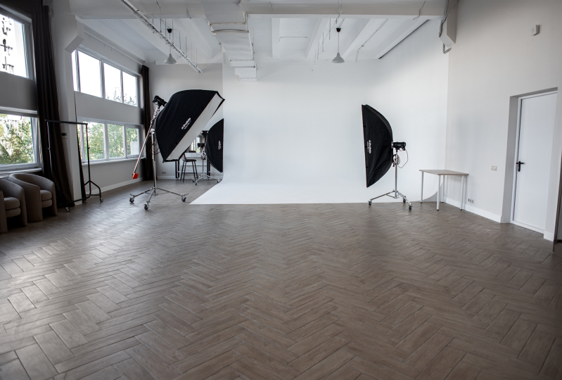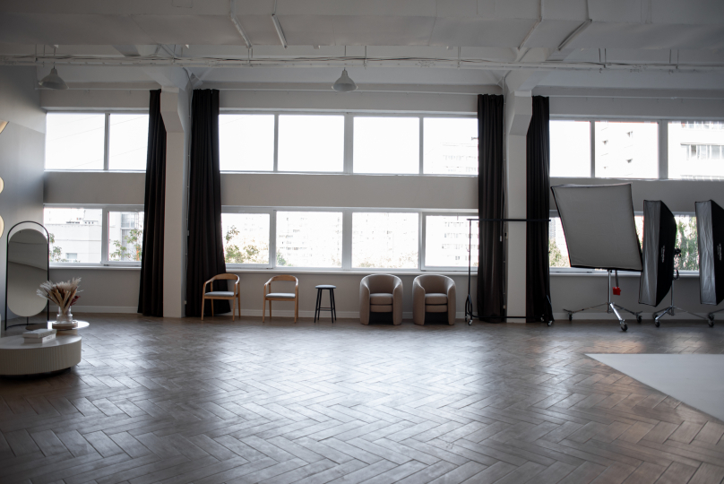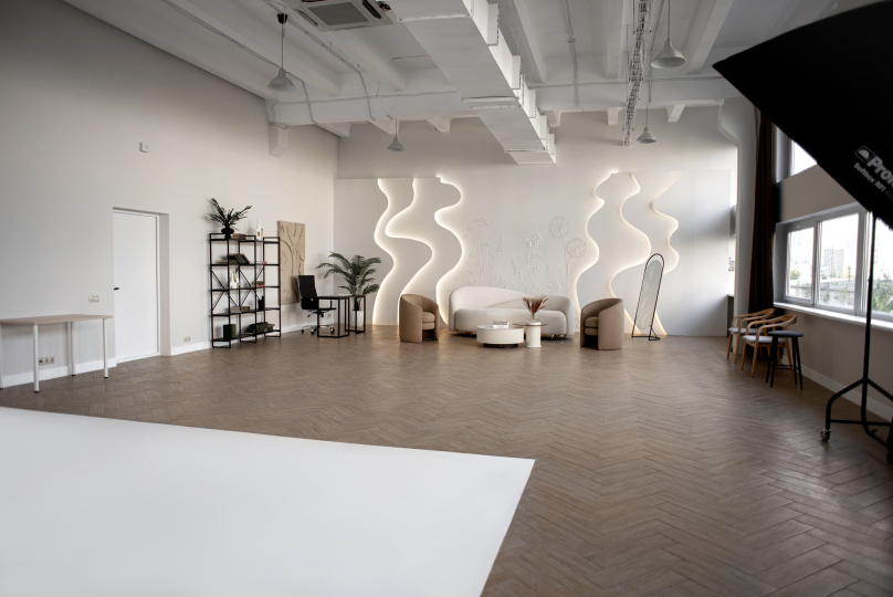 Просторный светлый зал 130 кв. м. с интерьером и угловой циклорамой.