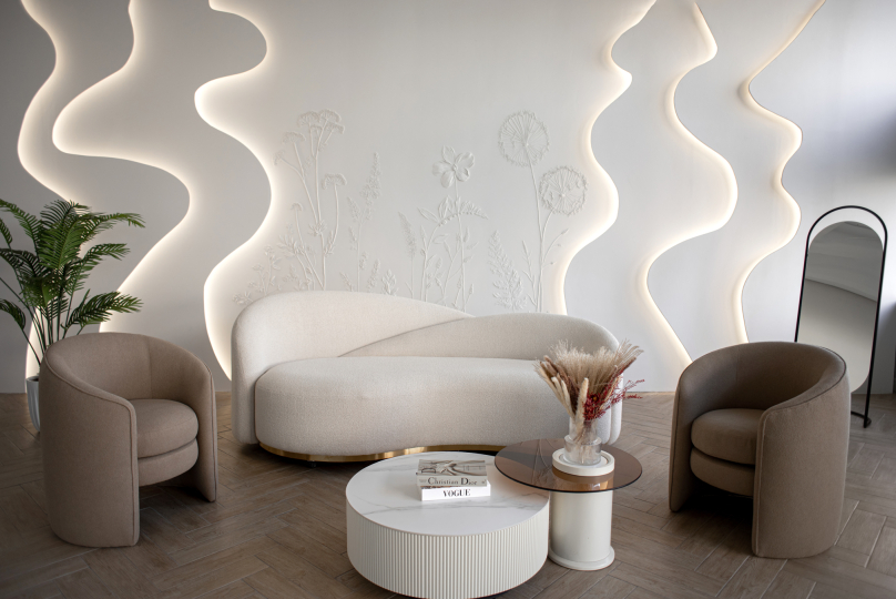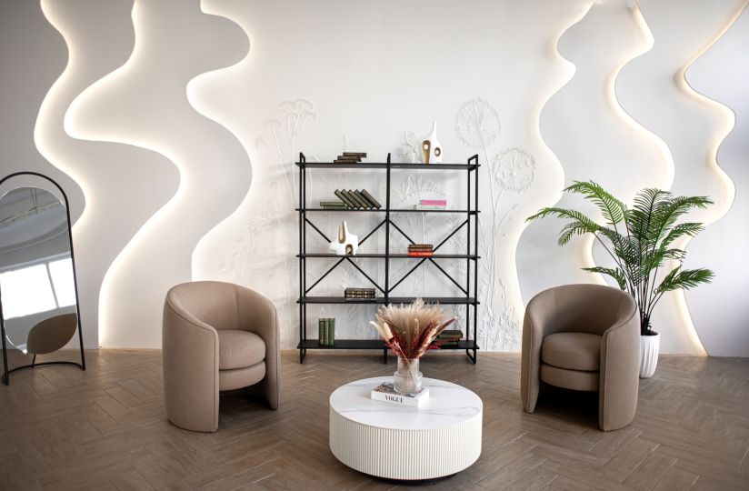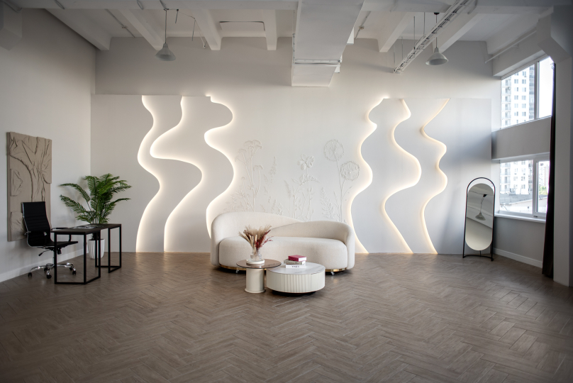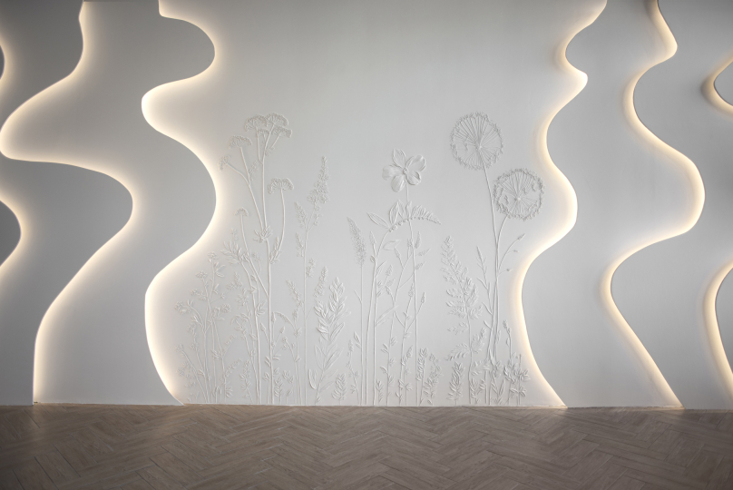 Монолитная стена со светодиодной подсветкой «волны» и флористический барельеф .