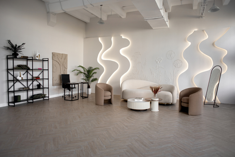 Пол из керамогранита под натуральное дерево матовый серо-бежевый раскладкой ёлочка.