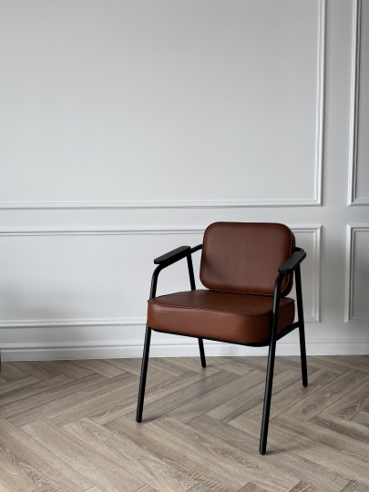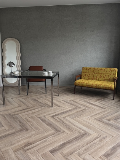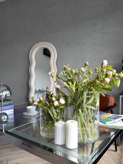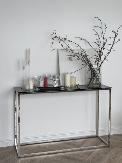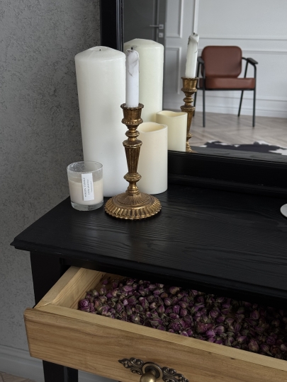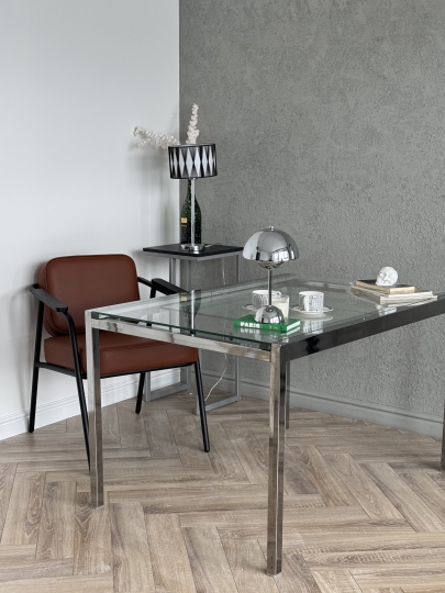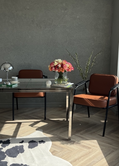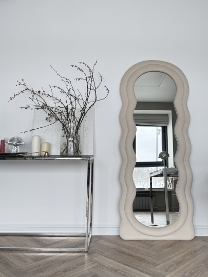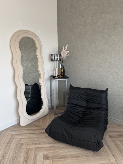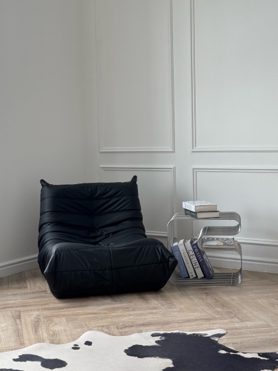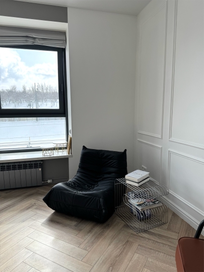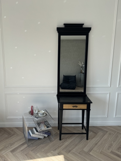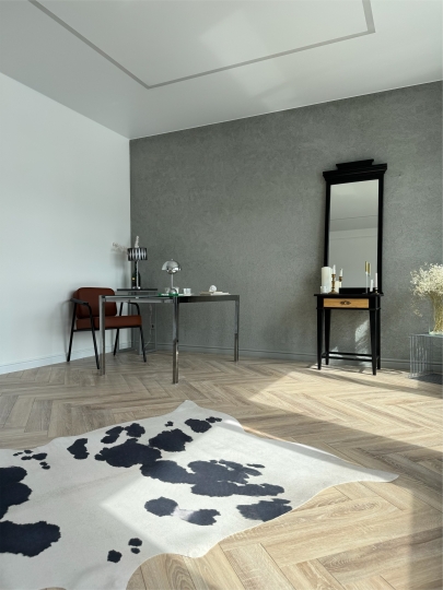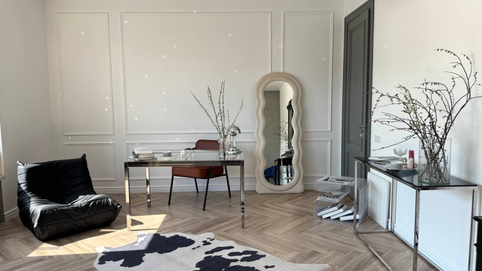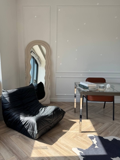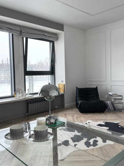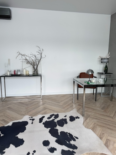 В зале стоят 2 коричневых кожаных стула, черное кожаное кресло togo, стеклянная консоль, белый камин и стеклянный стол. Лежит ковер-зебра, а так же в зале есть большое двухметровое велюровое зеркало и трюмо с зеркалом.